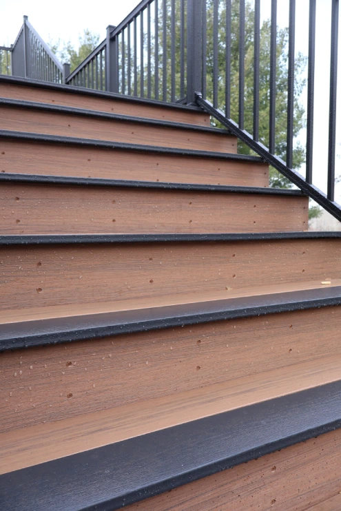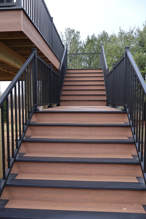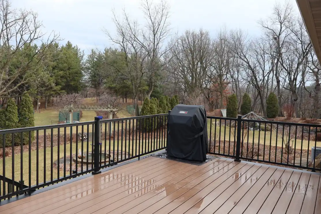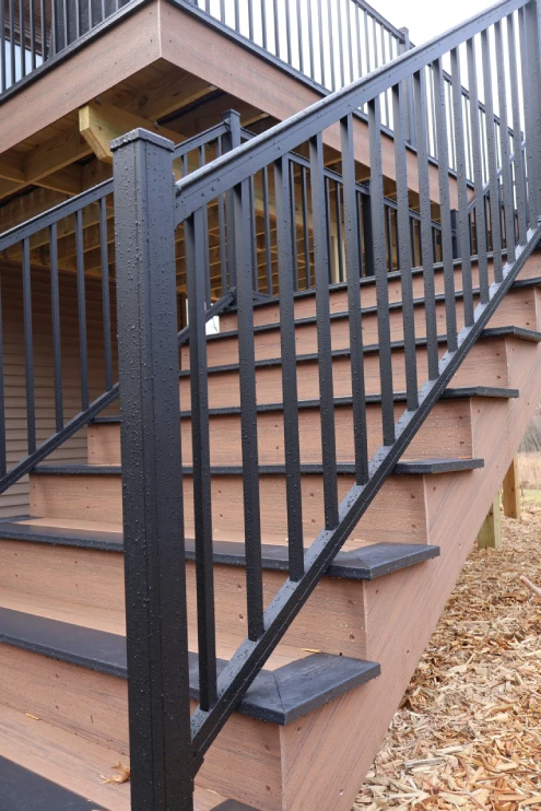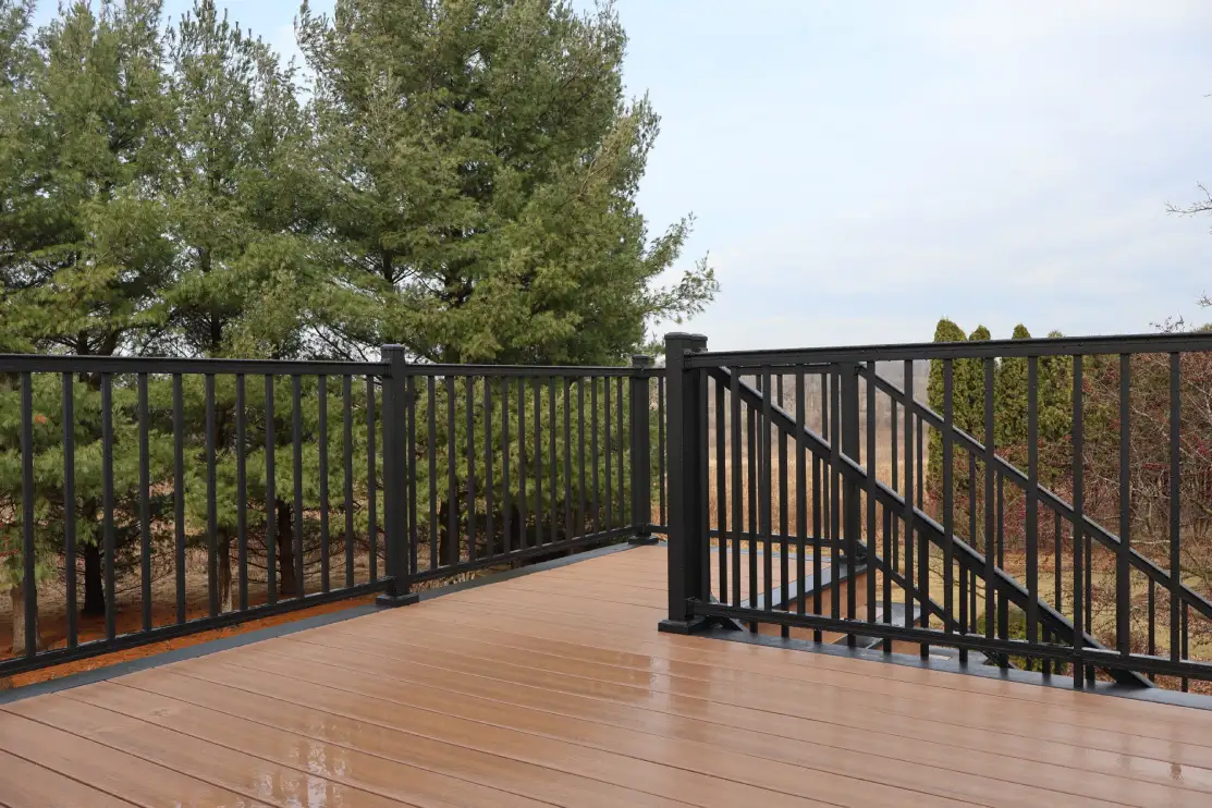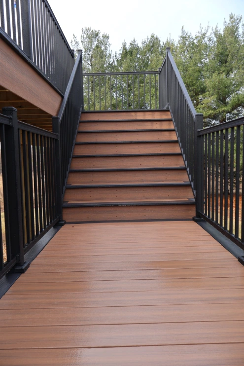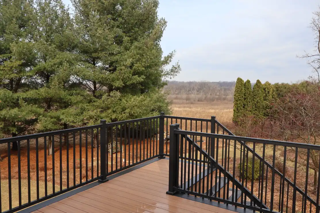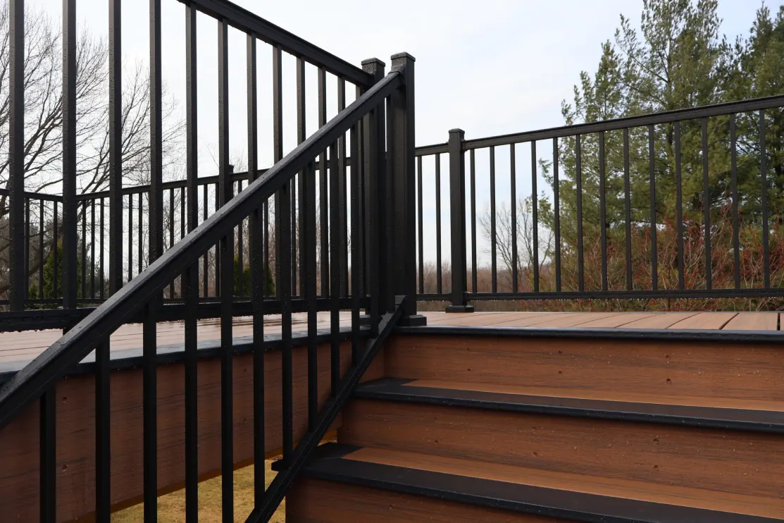 For this Deerfield home, we removed the existing decks and built two new structures (18’x12’ and 12’x12’) using AC2 ground-contact-rated treated lumber. Footings were excavated and poured to meet ensuring long-term stability. The decks feature Deckorators Voyage Series in Mesa with a Slate picture frame border, installed with hidden fasteners for a seamless look. Matching fascia and Deckorators Contemporary Railing with a Mesa drink rail add both style and functionality. A 5-foot-wide staircase was built for easy access, and custom aluminum cladding was installed at the house-to-deck junction for added protection.
