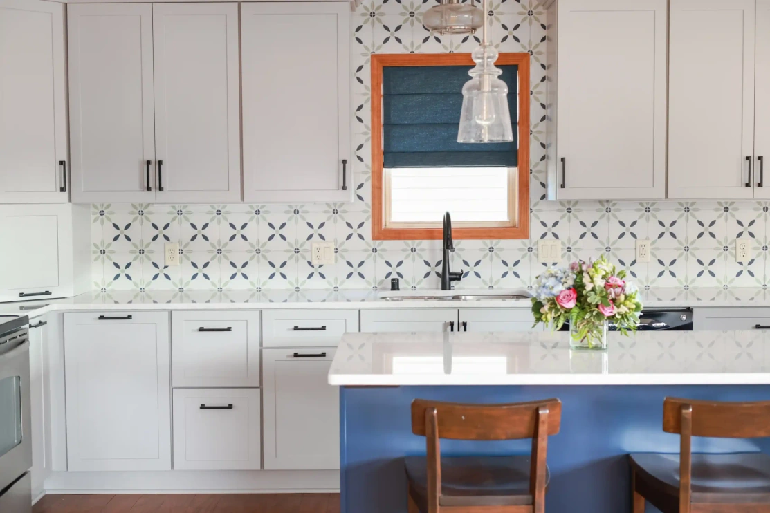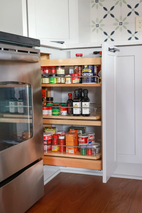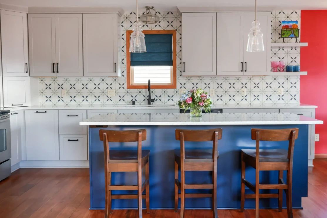 This renovation was all about making smart changes while keeping the original footprint. By preserving and just refinishing the existing flooring, we could focus on the fun stuff—like swapping out the builder-grade cabinets for brighter, custom ones with loads of storage options. We also transformed the basic closet into a personalized storage and feeding area for our client’s beloved dog. Our client’s love of color really shone through, and our collaborative design only enhanced the beauty of her vibrant choices.