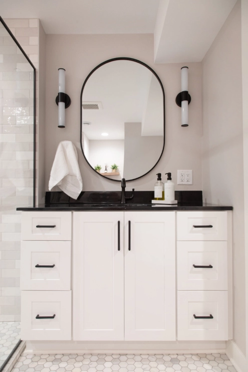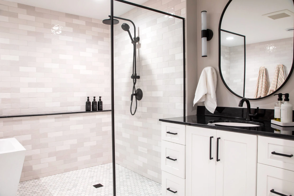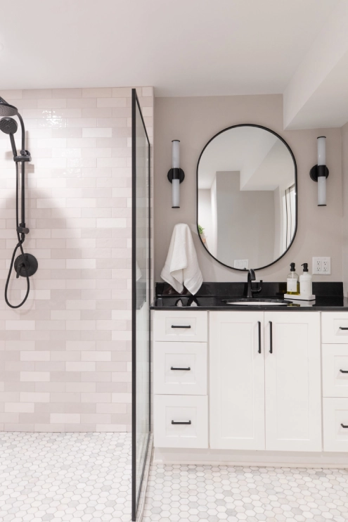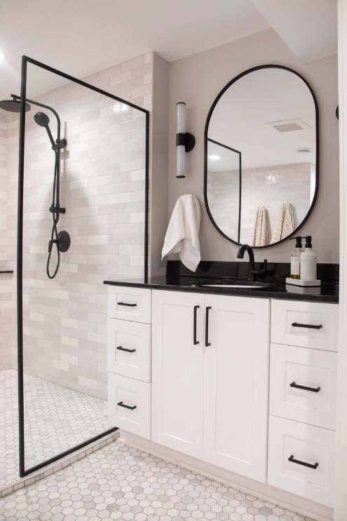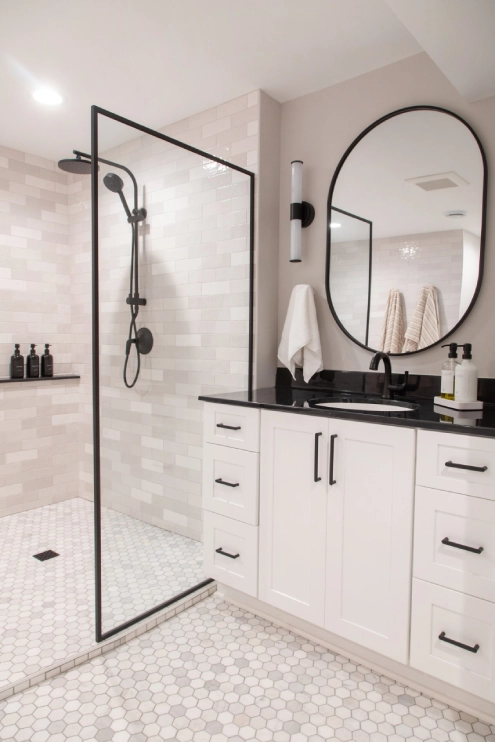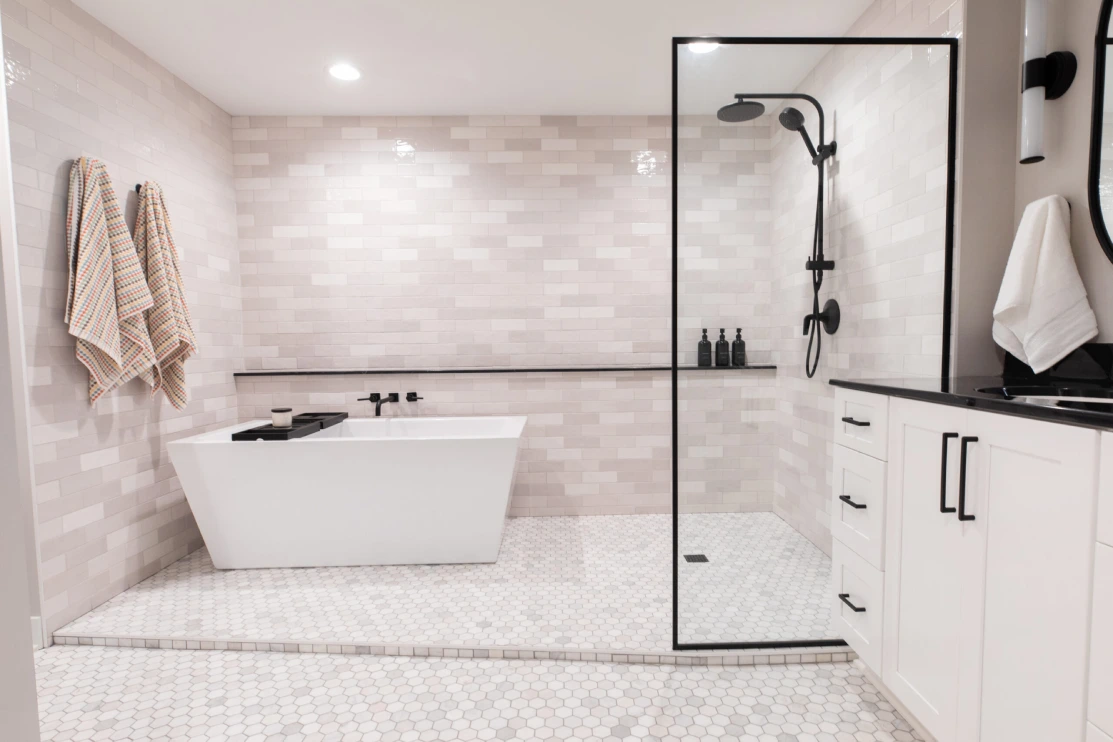In this unique basement bathroom, we created a spacious retreat that feels anything but typical. A freestanding bathtub takes center stage, while a walk-in shower sits opposite, offering both style and functionality. The blend of whites and blacks adds a modern warmth, combining elegance with simplicity to make this large bathroom a serene escape. It’s the perfect balance of luxury and comfort, transforming the basement into a welcoming, peaceful retreat.