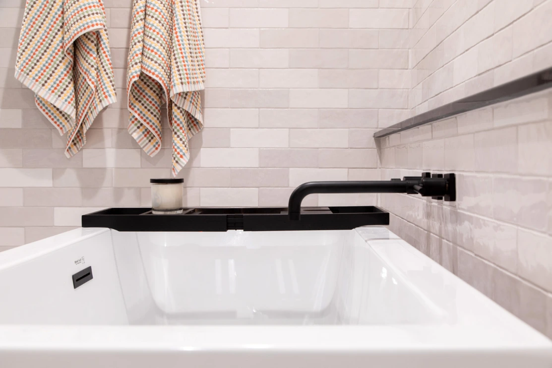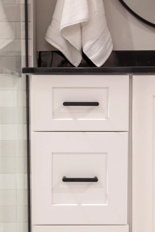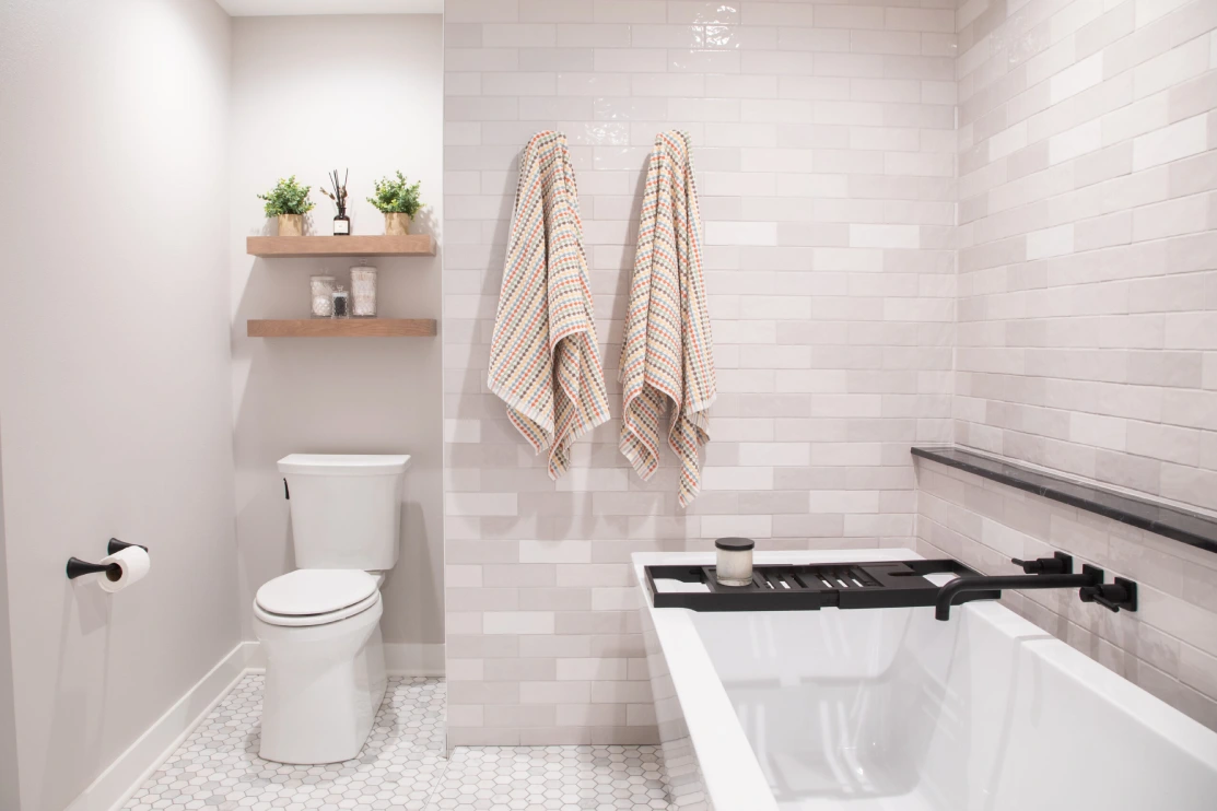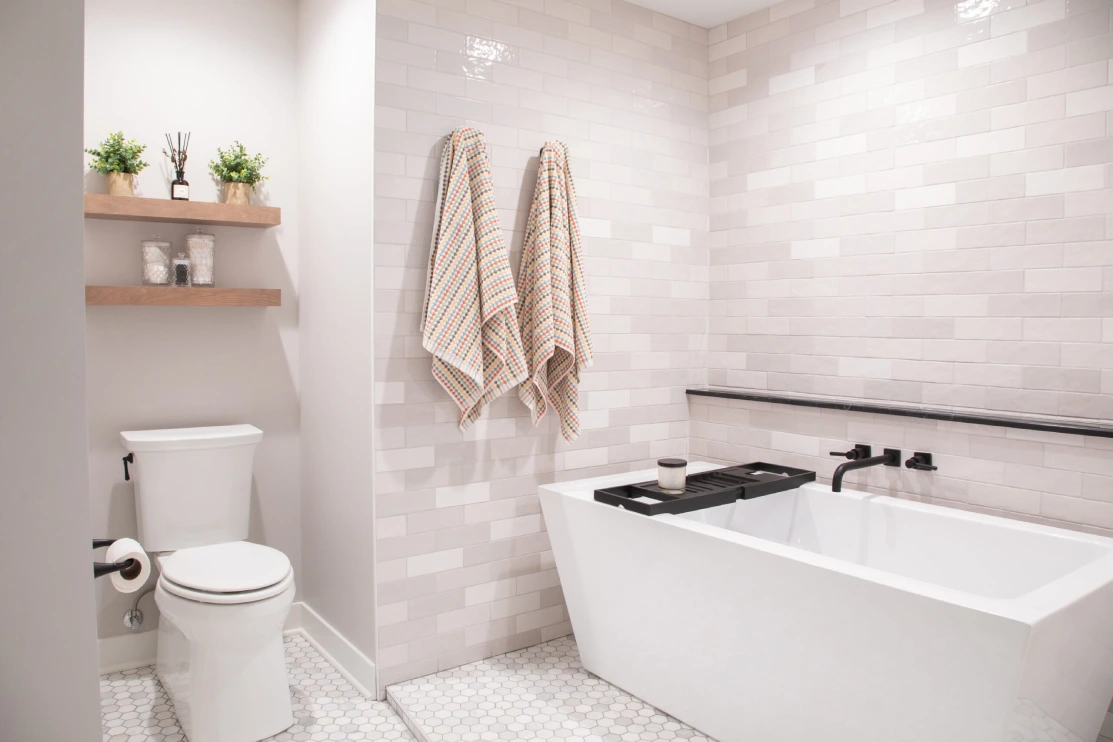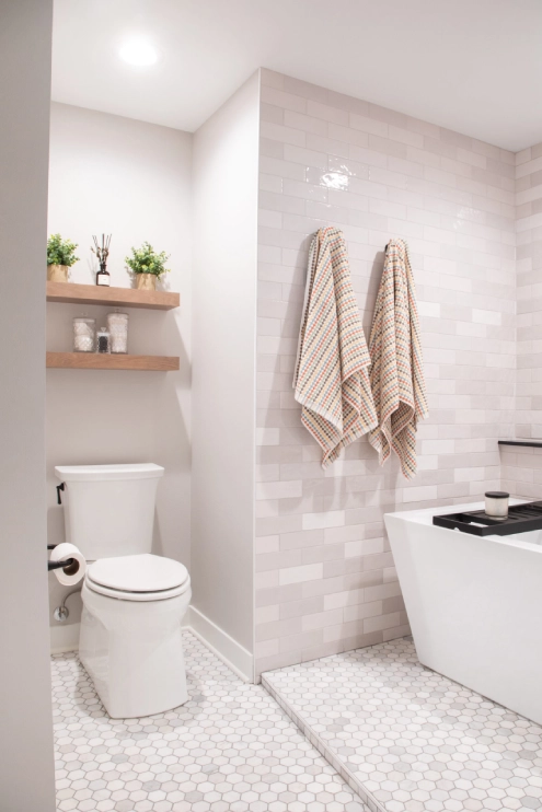 In this unique basement bathroom, we created a spacious retreat that feels anything but typical. A freestanding bathtub takes center stage, while a walk-in shower sits opposite, offering both style and functionality. The blend of whites and blacks adds a modern warmth, combining elegance with simplicity to make this large bathroom a serene escape. It’s the perfect balance of luxury and comfort, transforming the basement into a welcoming, peaceful retreat.